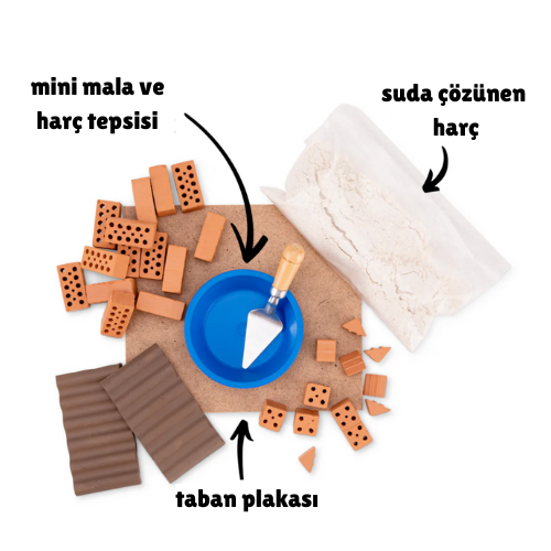 Minyatür bir mala ve harç tepsisi gerçekçi bir yapım deneyimi sunar. Seti yapmak için ihtiyacınız olan tüm araç gereçler sizeler gönderiliyor. Size de keyifle bir inşaat yapmak kalıyor.