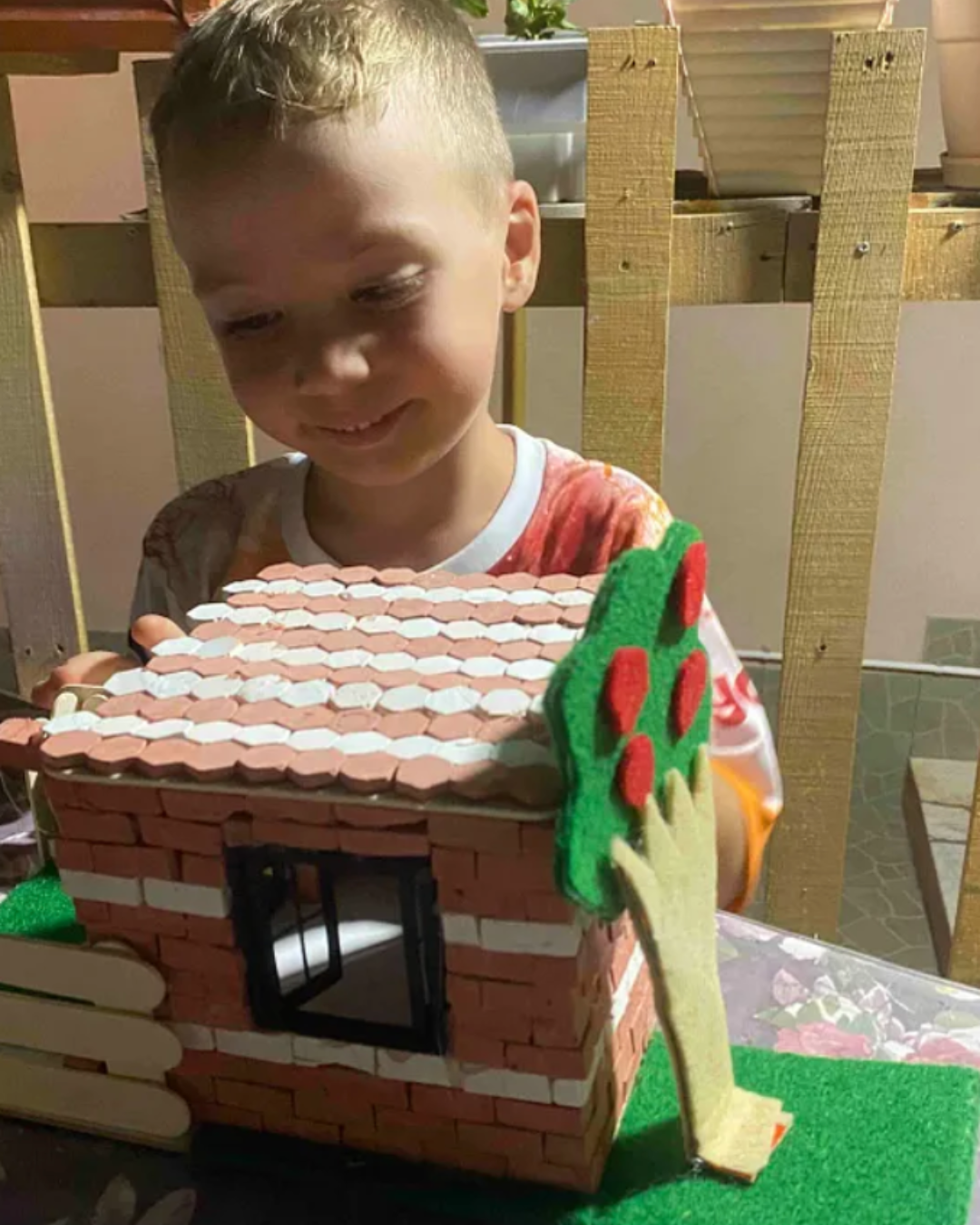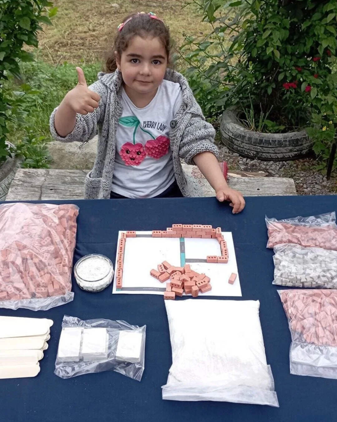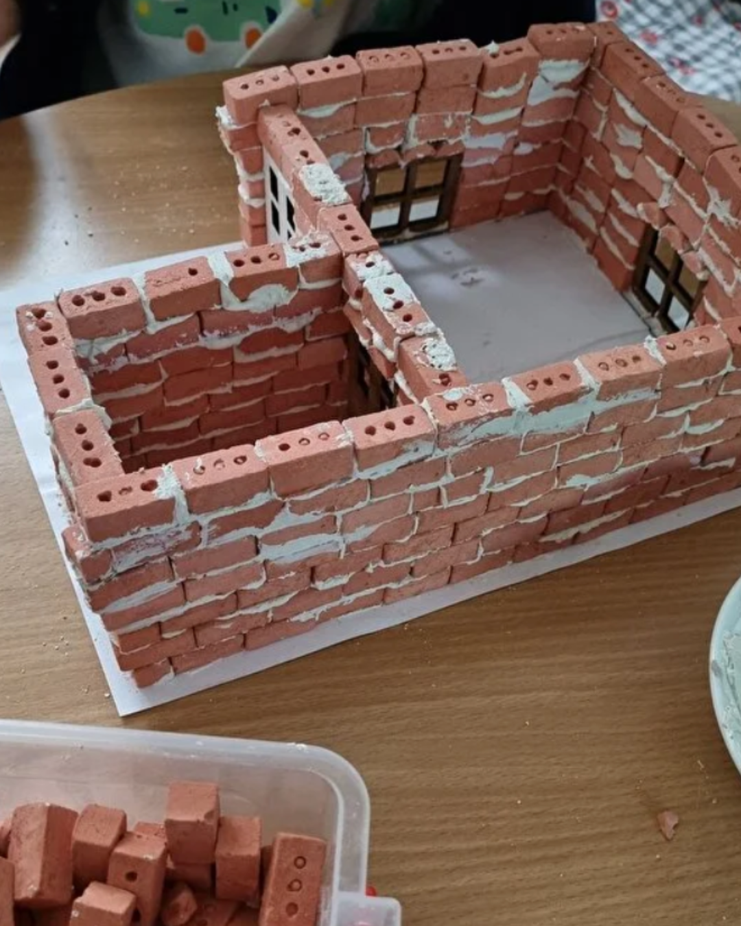 İçinden çıkan tabanlıkların üzerinde önce yapıştırıcı harcı az miktarda suyla karıştırarak çimento elde edip, ardından görseldeki ev modelini ya da kendi hayalinizi tuğlalarla oluşturarak seti inşa edebilirsiniz.
