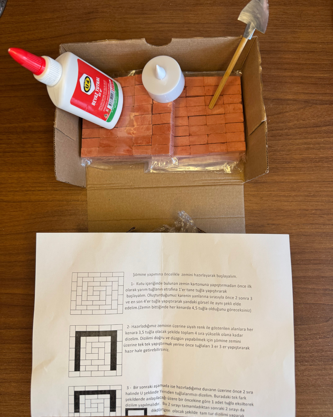 İçinden çıkan tabanlıkların üzerinde önce yapıştırıcı harcı az miktarda suyla karıştırarak çimento elde edip, ardından görseldeki ev modelini ya da kendi hayalinizi tuğlalarla oluşturarak seti inşa edebilirsiniz.